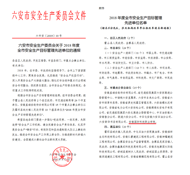 近日,六安市政府安全生产委员印发文件,对2018年度全市安全生产目标管理先进单位进行表彰通报,beat365被授予“2018年度全市安全生产目标管理先进单位”荣誉称号,是获此荣誉的唯一学校单位,也是beat365连续六年获此荣誉称号。