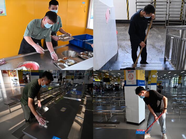 在食堂,可以看见他们埋头拖地的身影,可以看见他们收集整理餐具的身影,可以看见他们帮忙搬运食物的身影……他们身着军绿色军装,发扬不怕苦不怕累的部队优良传统作风,效率高,执行力强,勤勤恳恳,任劳任怨,认真做好每一份工作,在学校疫情防控工作中默默贡献自己的一份力量,他们是春日校园里最耀眼的那抹“绿”。他们的努力和守护赢得了学校师生的一致点赞,同学们在食堂就餐时也积极主动配合将碗筷分离,放入相应的区域,减少志愿服务者们的工作压力。