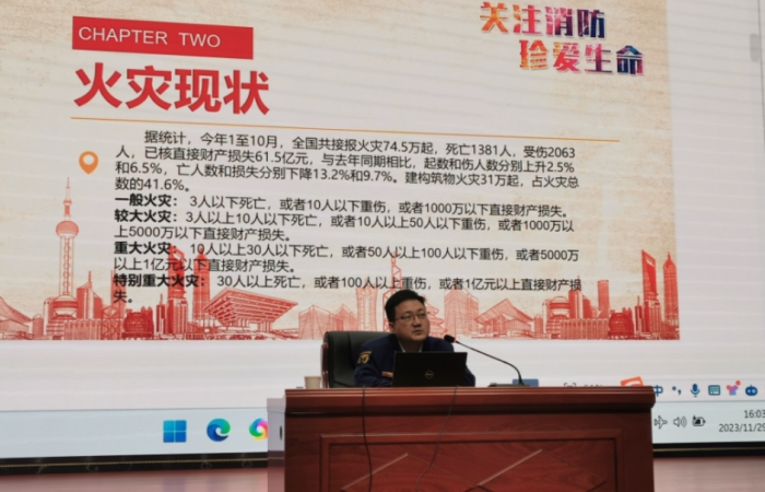 会上,周龙分析了火灾现状,通过播放近年来发生的多起重大典型火灾事故以及安全警示教育片,让全体师生意识到消防安全责任及消防安全工作的重要性。随后周龙以单位履行自身消防安全主体责任,强化内部管理为重点,讲解了国务院办公厅印发的《消防安全责任制实施办法》、提升单位消防安全标准化管理水平、单位内部“五实N岗”责任体系、单位常见消防安全隐患分析等消防安全知识。通过培训,使全体参训人员深刻认识到了“隐患险于明火、防范胜于救灾”的重要性。