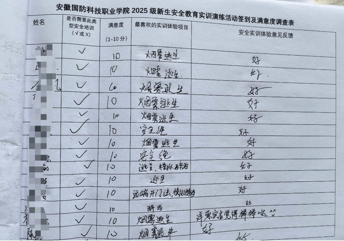 实训内容涵盖模拟灭火、烟雾逃生、结绳自救、防醉酒体验、防诈骗宣传、海姆立克急救法训练、VR沉浸式安全教育及禁毒模型展示等多个模块。各项目设计紧密结合高校实际生活场景,将抽象的安全知识转化为可操作、可体验、可感悟的实际技能,有效增强了师生应对突发事件的自救互救能力。体验完,还对师生进行了满意度调查,不少参与师生表示,此次安全教育“看得见、摸得着、学得会”,不仅内容实用、形式新颖,更在沉浸式体验中真正实现了“安全知识入脑入心”。学生们普遍反映,这样的活动远比传统课堂讲授更具感染力和实效性,期待学校未来能持续开展类似实践教育活动。