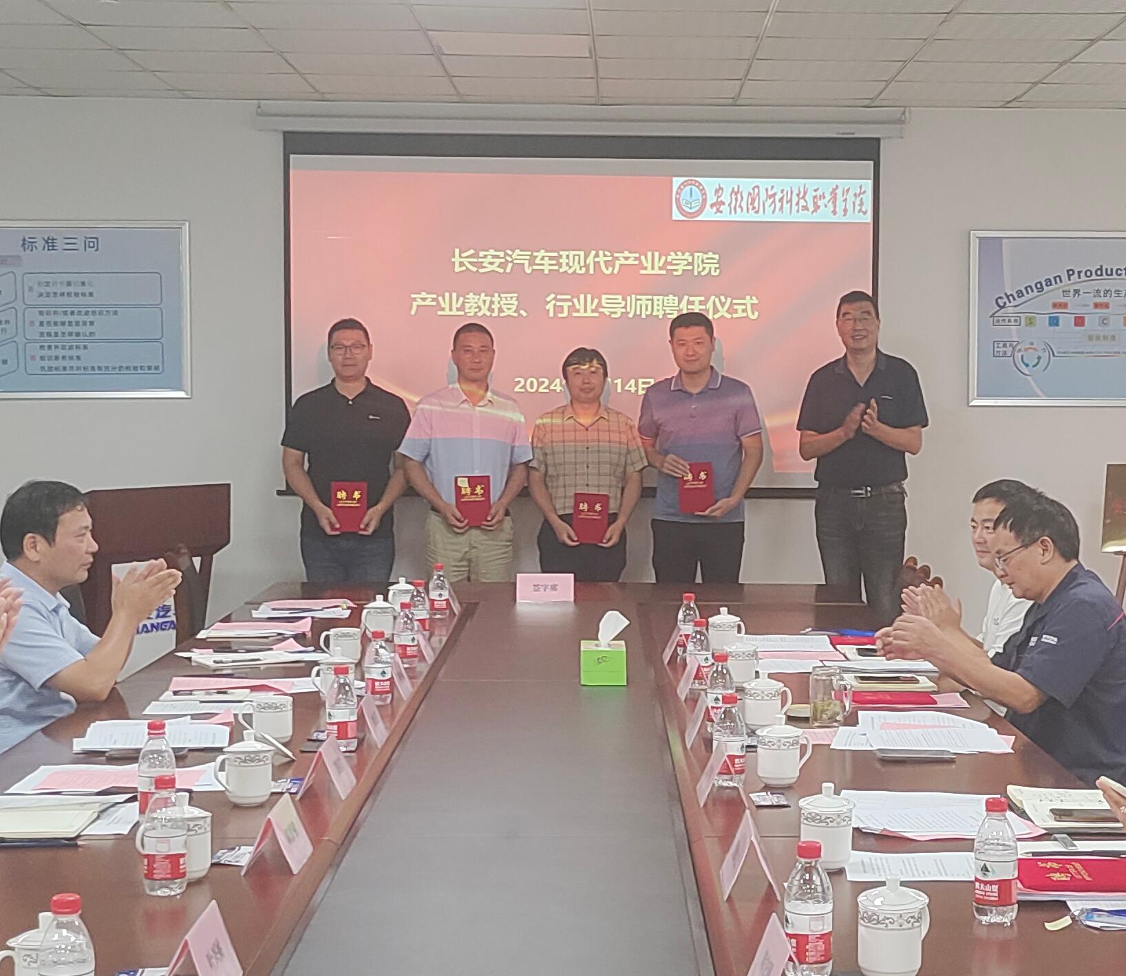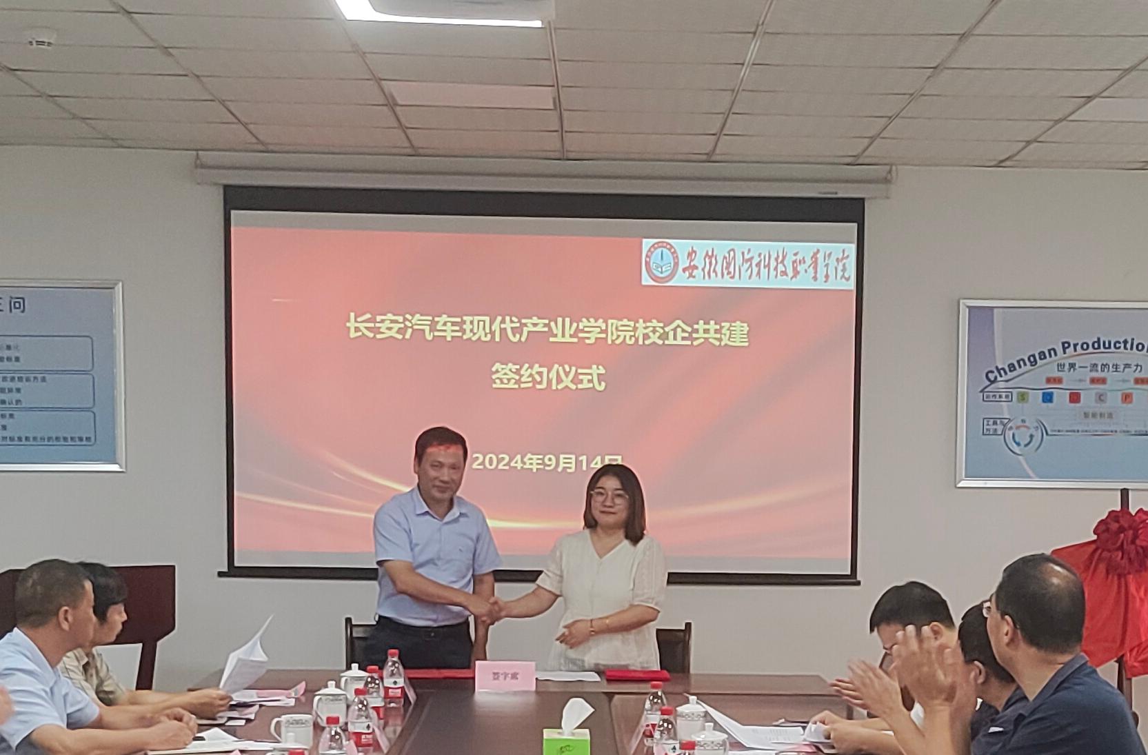 随后,学校分别与产业学院共建企业合肥长安汽车有限公司、合肥至信机械制造有限公司、安徽强龙工业有限公司签订了《长安汽车现代产业学院校企共建合作办学协议》,徐正红与徐耀共同为产业学院揭牌。