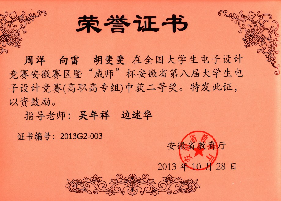 2013 年全国大学生电子设计竞赛暨“威师”杯安徽省第八届大学生电子设计竞赛于9月初落下帷幕。在认真总结去年所获成绩的基础上,我院年轻老师积极备赛,认真指导,经过初赛和最后的综合测试,我院机电工程系参赛代表队中,高彬彬、姚中宇、周学士3位同学获得高职高专组一等奖,向雷、胡斐斐、周洋3位同学获得高职高专组二等奖。