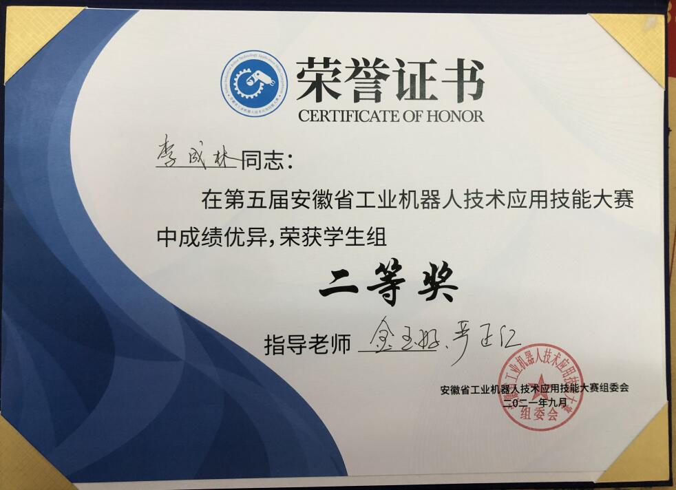 值此教师节之际,在前方赛场传来佳讯,工业机器人专业金玉好老师和学生李成林在第五届安徽省工业机器人技术应用技能大赛中,获得二等奖的好成绩!再此对金玉好老师和学生李成林表示热烈的祝贺!