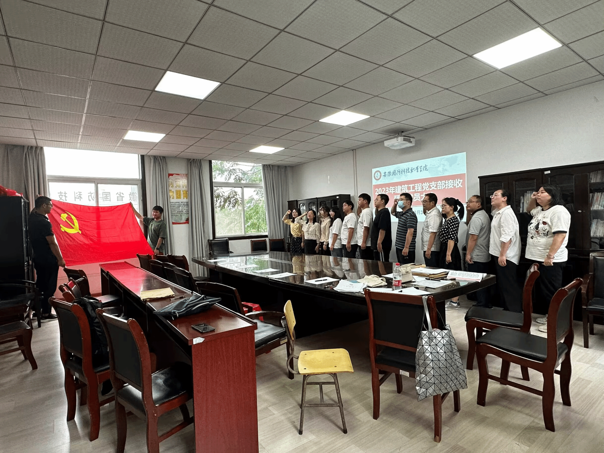 最后,新老党员在党旗下进行了庄严的入党宣誓仪式。此次大会充分体现了党内的民主性,增强了党内同志的交流,不仅为党组织补充了新鲜血液,也增强了支部的凝聚力和向心力。