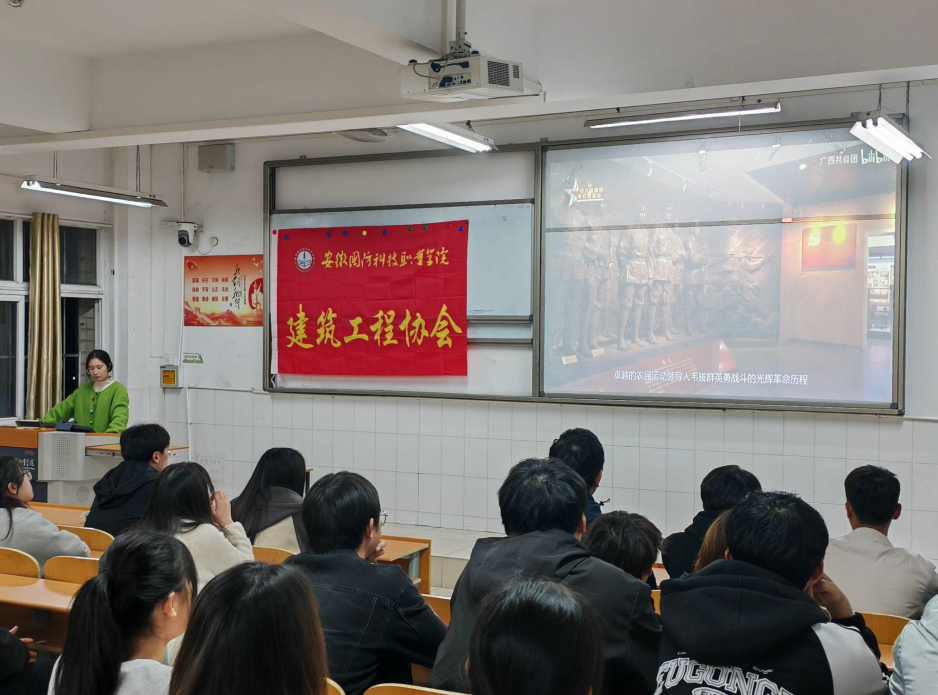 本网讯 (学生通讯员 赵文强) 为了深入挖掘红色文化资源,传承红色基因,弘扬革命精神,推动红色文化建设。 2024年3月28号,建工协会在二教105开展“传承·弘扬·发展红色建筑”主题讲座。活动由会长宋远龙主持,协会指导教师高烨主讲,城市建设学院部分同学参加了此次活动。