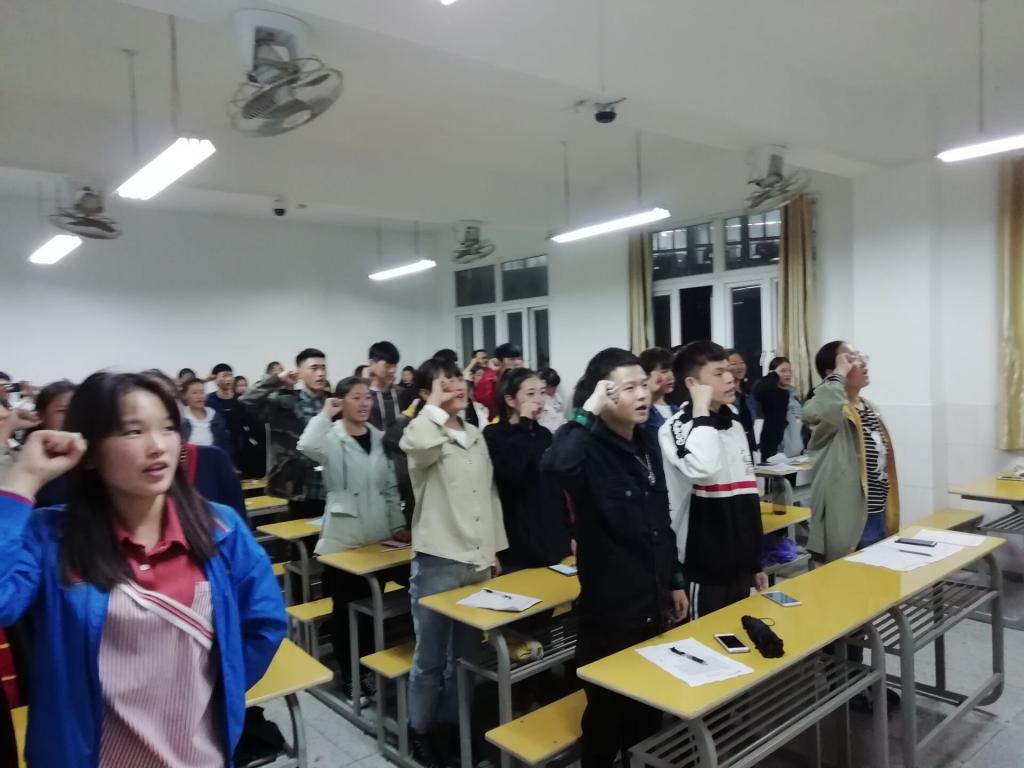最后一个环节,在18会计1班班长的带领下,全体团员们起立宣誓,重温入团誓词,在嘹亮的团歌中,同学们再次接受了一次思想洗礼。