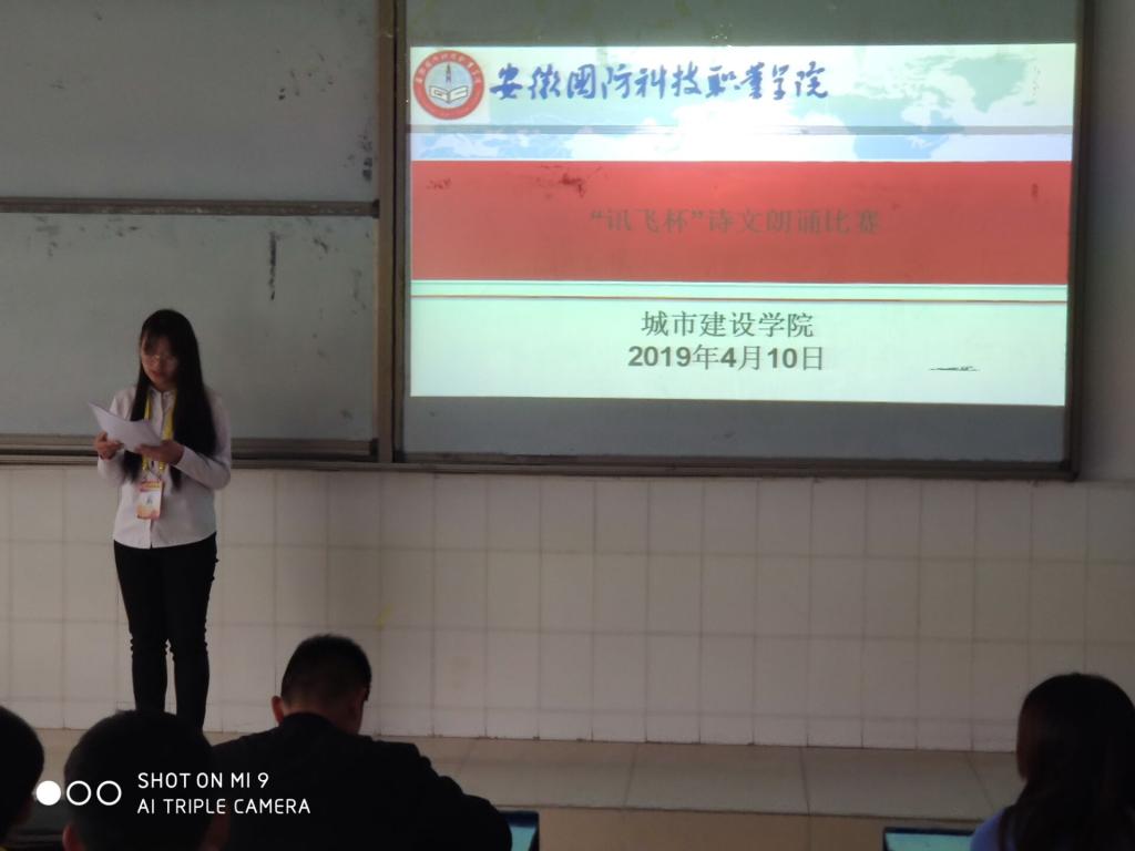 为提升大学生艺术素养和综合素质,宣传社会主义核心价值观、弘扬优秀文化传统,2019年4月10日下午,城市建设学院学生会在二教105举办第十四届“讯飞杯”诗文朗诵比赛。