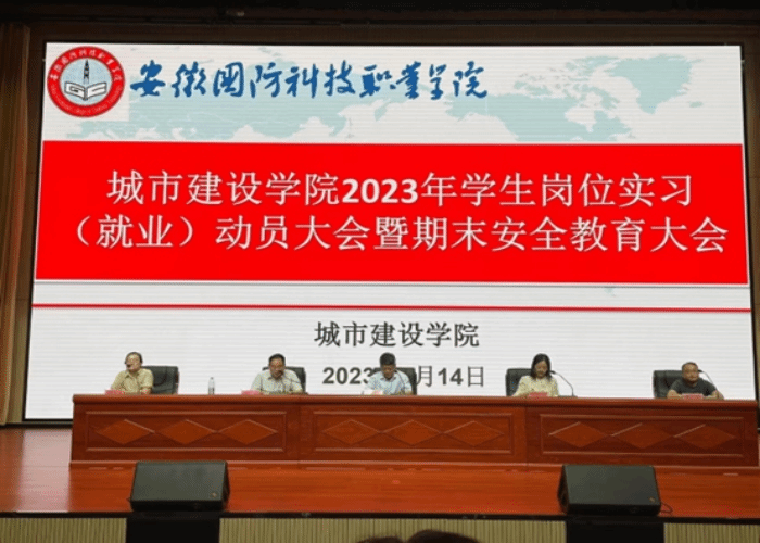 本网讯(城市建设学院 袁小永)为做好2023年学生岗位实习工作,近日城市建设学院在学校产教融合中心报告大厅召开了2023年岗位实习(就业)动员大会暨期末安全教育和文明离校大会,城市建设学院党总支书记张宗江、院长王红林、副院长左飞、组织员胡仕婷、辅导员、岗位实习指导教师及全体2024届毕业班班主任、毕业生参与会议,会议由副院长左飞主持。