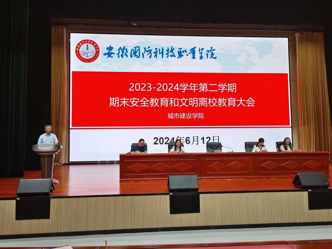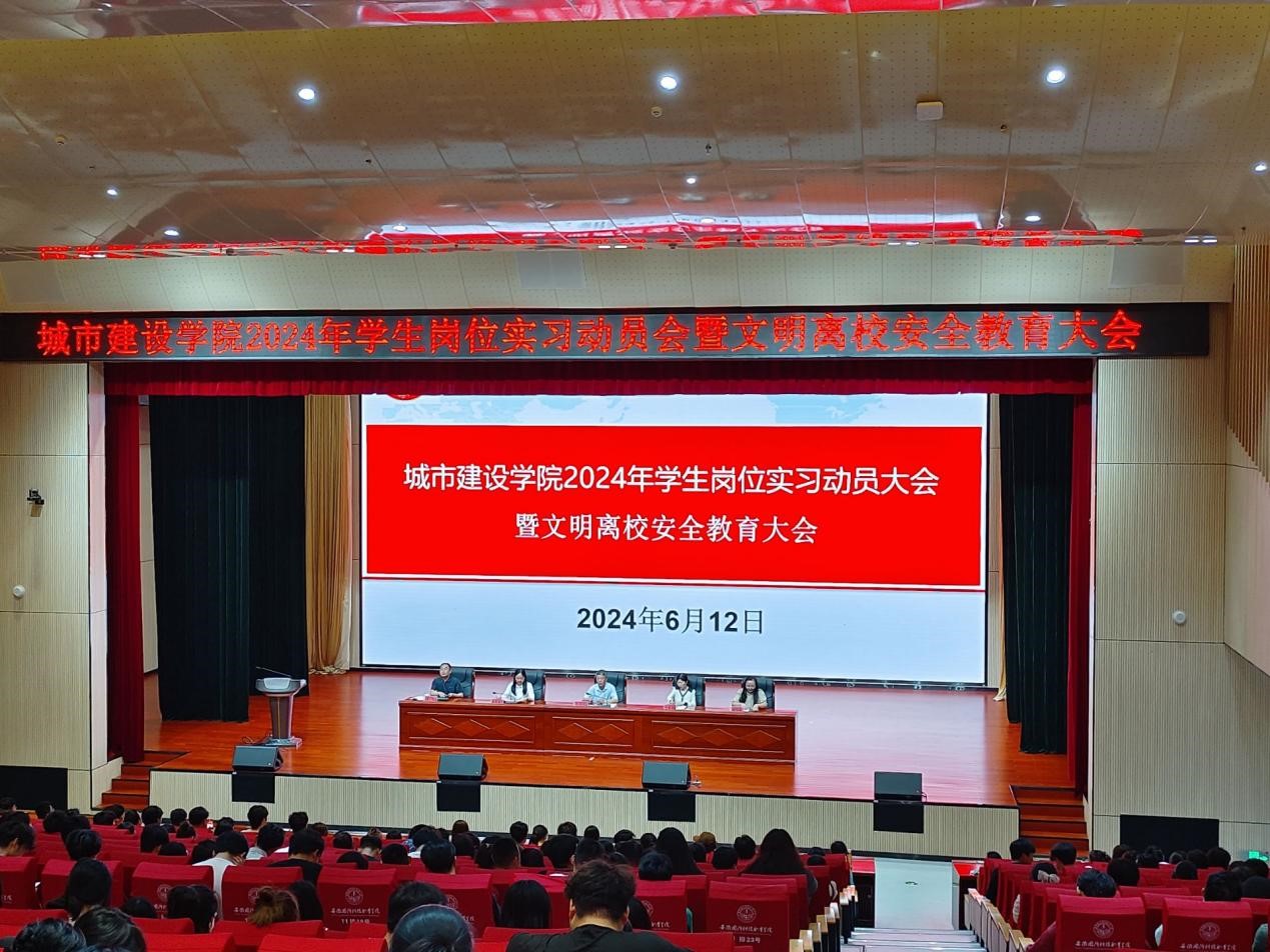 本网讯(城市建设学院 袁小永)为做好2024年学生岗位实习工作,6月12日晚,城市建设学院在学校产教融合中心报告大厅召开了2024年岗位实习动员大会暨期末安全教育和文明离校大会,城市建设学院党总支书记张宗江、院长王红林、副书记叶高洁、副院长左飞、组织员胡仕婷、辅导员、岗位实习指导教师及全体2025届毕业生参加会议,会议由副院长左飞主持。