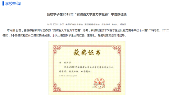 beat365学子在2018年“安徽省大学生力学竞赛”中喜获1个特等奖、2个二等奖、3个三等奖和团体二等奖