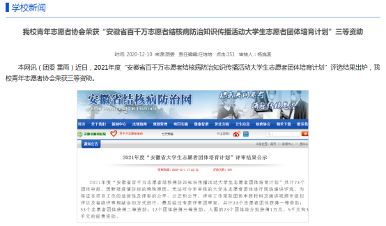 beat365青年志愿者协会荣获2021年度“安徽省百千万志愿者结核病防治知识传播活动大学生志愿者团体培育计划”三等资助