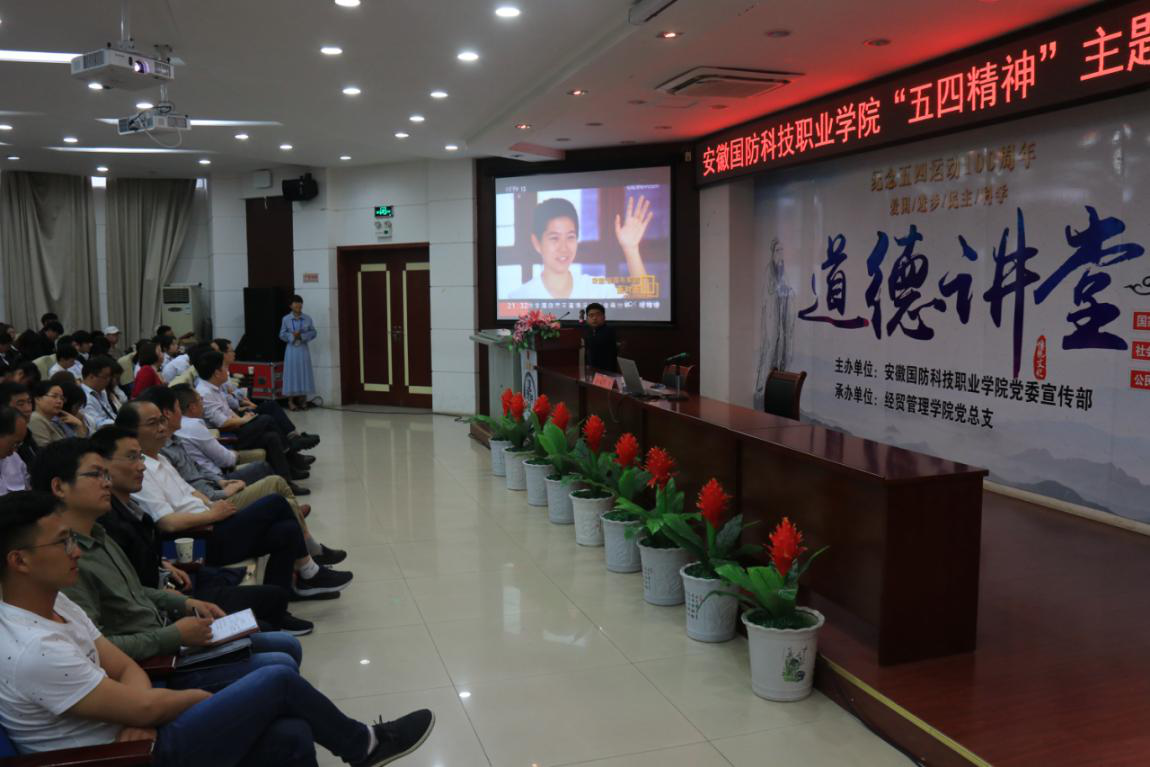 为纪念五四运动100周年,弘扬中华传统文化,加强学生思想道德建设,5月15日下午,beat365以“五四精神”为主题的道德讲堂活动在校图书馆报告厅隆重举行。本次道德讲堂活动由校党委宣传部主办、经贸管理学院承办。校党委书记余嗣元、校长李麟书、副校长冯伦久等领导出席活动,经贸管理学院全体教职工、思政课老师、辅导员和全校200余名学生参加了此次活动。活动邀请团市委机关党支部副书记(省委讲师团青年讲师)丁圜作专题报告。活动由经贸管理学院团总支书记付玉梅主持。