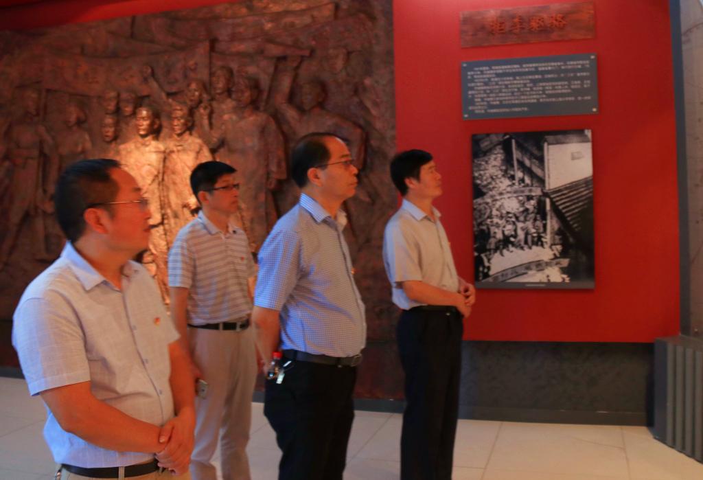 党委书记余嗣元(右一),校长李麟书(右二),党委副书记、纪委书记朱德明(右三)、副校长冯伦久(右四)等参观纪念馆