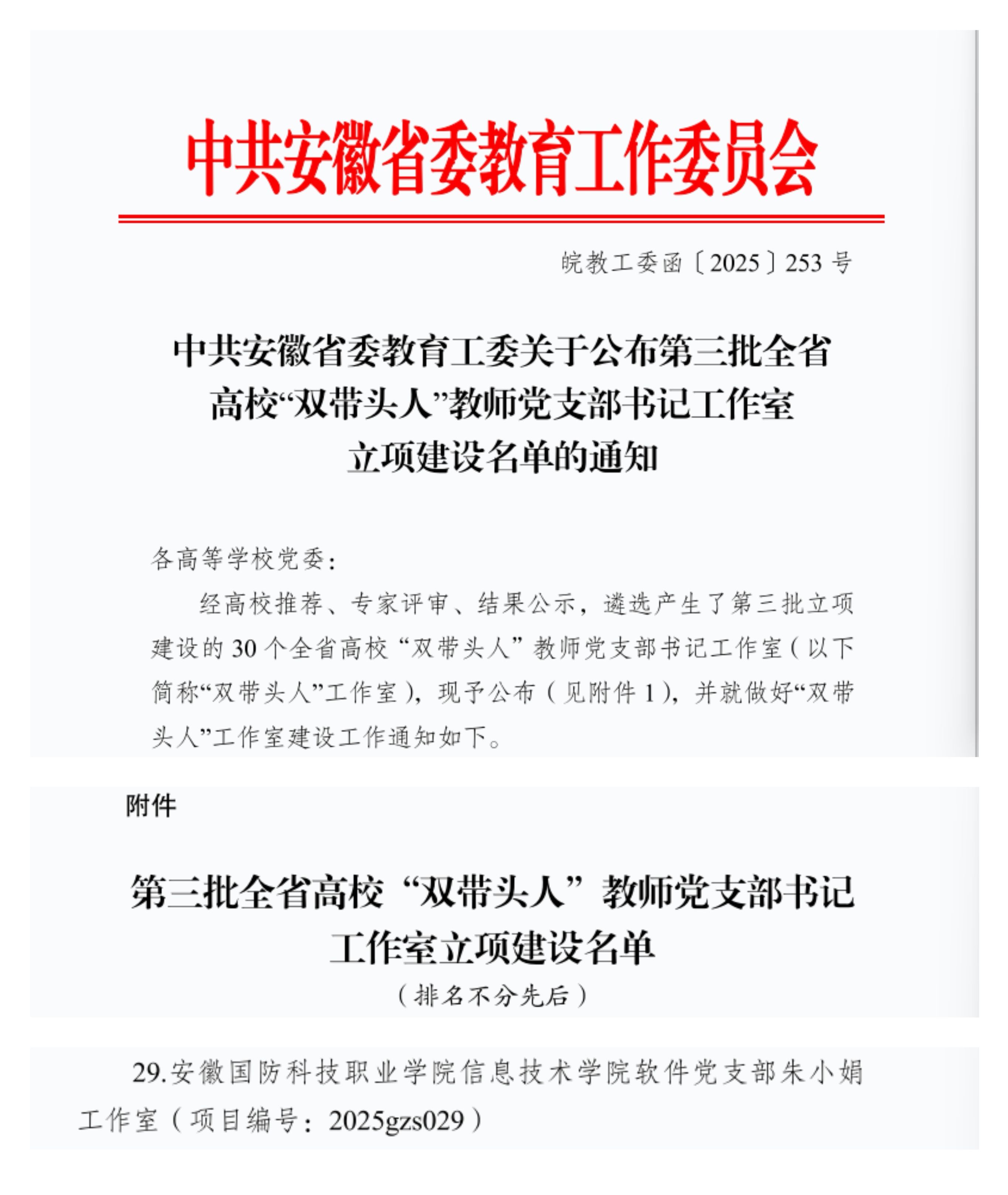 近日,省委教育工委公布第三批全省高校“双带头人”教师党支部书记工作室立项建设名单,全省高校共30个“双带头人”教师党支部书记工作室入选,信息技术学院软件党支部朱小娟工作室名列其中。
