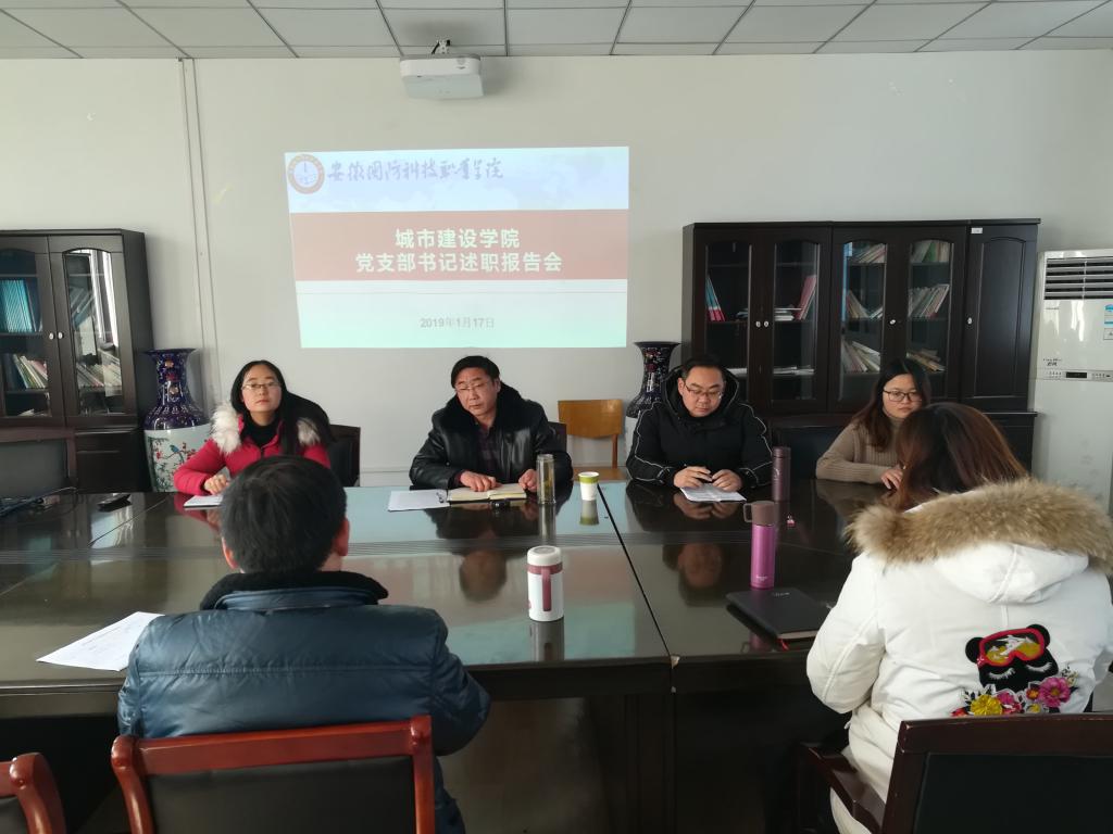 岁末年关,一年的时间匆匆而过,为了对学院两个党支部所做的成绩进行评议,城市建设学院于1月17日下午2点30召开党支部书记述职报告会。会议由党总支副书记叶启衡主持,纪检委员王红林、一支部书记黄波、二支部书记张凤、党员教师代表左飞、赵之元参与会议。