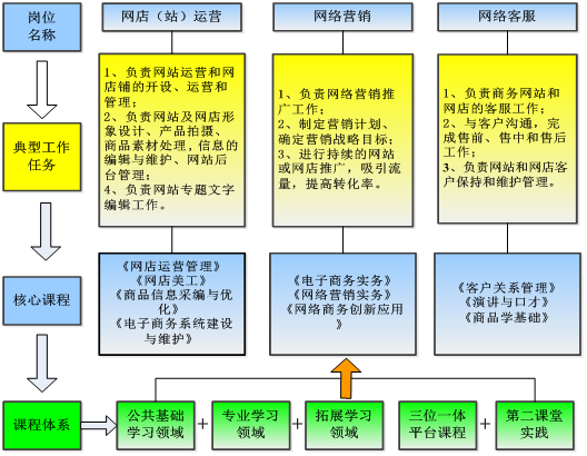 本专业培养德智体美劳全面发展,掌握扎实的科学文化基础和零售管理、供应链管理、市场与网络营销、商务数据分析、互联网销售、客户服务管理、电子商务法律法规等知识,具备运营数据采集与分析、用户运营与管理、商品发布与优化、社群运营管理、全渠道营销方案设计、O2O 销售、智能客服训练、视觉营销设计、互联网产品规划与开发等能力,具有工匠精神和信息素养,能够从事数据化运营、网店运营、社群运营、行业运营、营销活动策划与执行、销售方案执行与优化、客户服务管理、视觉设计、互联网及电商产品开发等工作的高素质技术技能人才。