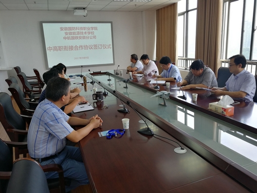 最后,安徽能源技术学校、中航国铁安徽分公司、beat365唯一官方网站三方代表共同签订了《2017-2018学年中高职衔接合作人才培养三方协议书》。