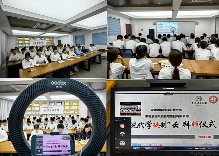 5月18日,学生在实训楼403开展了苏州书香酒店线上拜师活动。书香酒店投资集团党委副书记钱恩妮致辞,她向校方为企业持续输送优秀人才表示感谢,为即将开启的校企深度融合满怀期待,同时对店方派出的行业导师提出了严格而明确的要求,表示要以责任感致力于为学校和行业企业培养优秀酒店人才。随后,经贸管理学院院长杨力发言,他肯定了现代学徒制在酒店管理人才培养的重要作用,希望同学们在校企双导师的带领下,发挥自己特长,将课堂知识与实践技能相融合,学习本领、提高技能。最后,学生与连线师傅,师徒亲切交流。