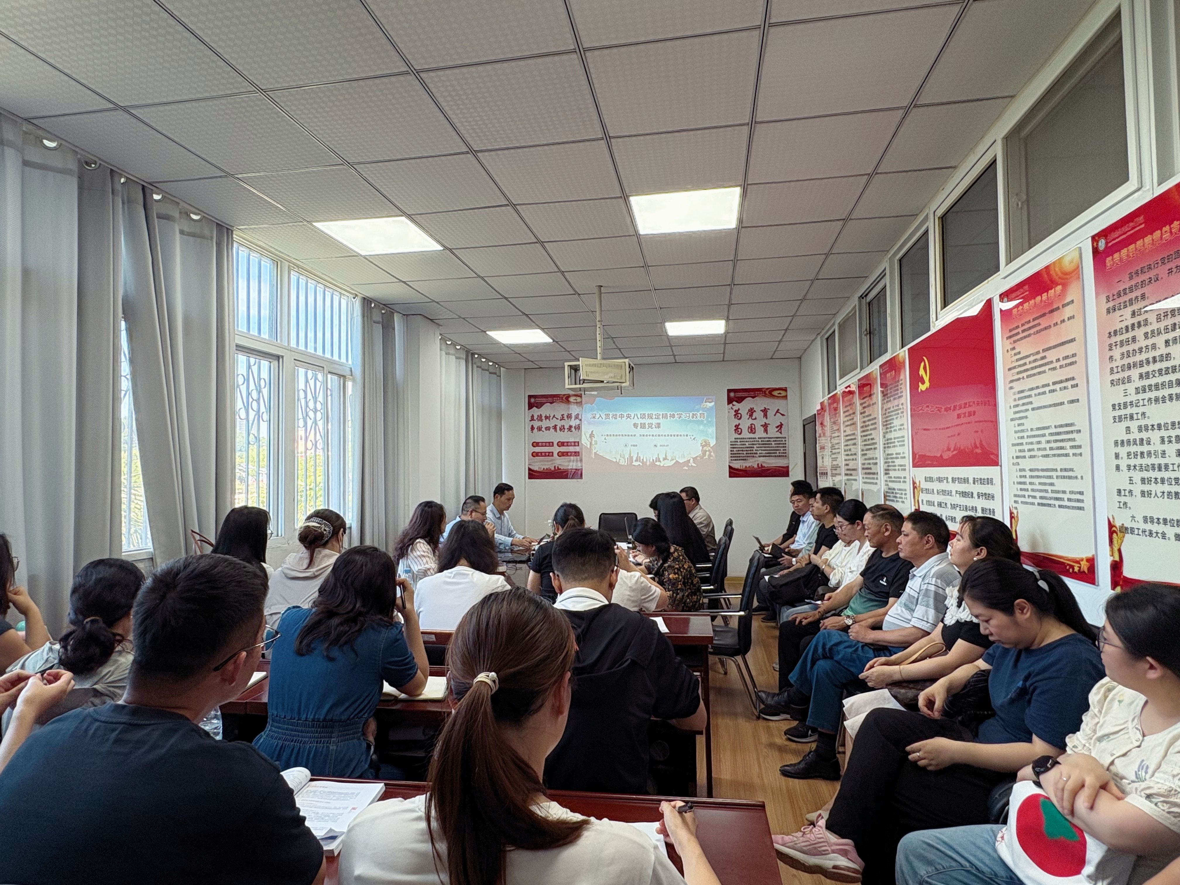 党课围绕“重温八项规定的主要内容”“违反中央八项规定精神主要表现”“违反规定适用的党纪条规”三个方面展开,结合学校工作实际和高校领域典型案例,深入阐述了中央八项规定精神的丰富内涵,全面分析了违反中央八项规定的具体表现,鲜明指出了贯彻落实的实践要求。