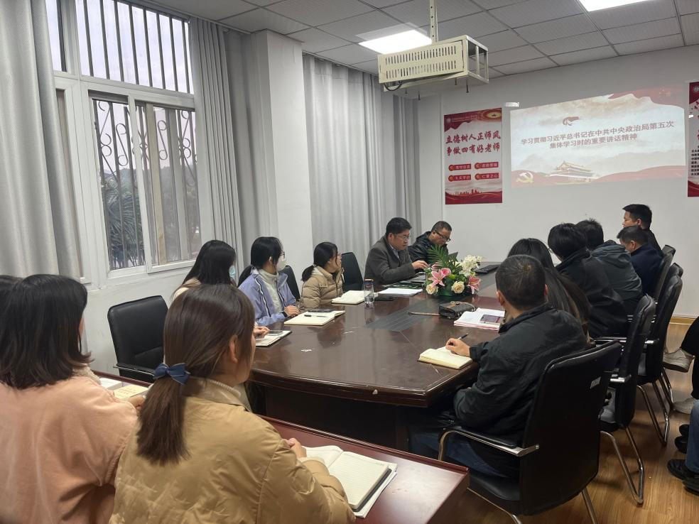 本网讯(经贸管理学院 马玲)11月15日下午,工商管理党支部书记杨力主持召开支部党员学习会议,传达学习贯彻习近平总书记在中共中央政治局第五次集体学习时的重要讲话精神,部署学习宣传和贯彻落实工作,支部全体党员参会。
