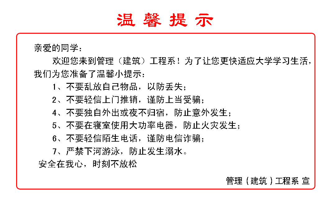 初来乍到,面对陌生的环境,很多新生会有所不适。系团总支在迎新前夕就制作了温馨小提示,由班主任在新生报到第一时间分发,提醒刚入校园需注意的常见事项,有效避免新生出现各类安全问题。