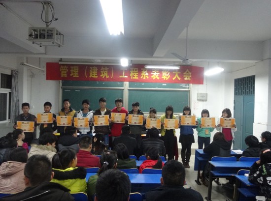 12月6日下午,管理(建筑)工程系在二教105教室隆重召开2013-2014学年第一学期表彰大会。管理(建筑)工程系党总支书记杜先扬、党总支副书记杨力、13级辅导员丁辉老师、11级辅导员付玉梅老师、12级辅导员雷雨老师出席大会,部分学生代表参加会议,会议由团总支书记李文君主持。
