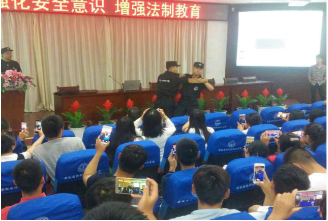 讲座中,张警官用通俗易懂的语言向大家介绍了校园八大安全隐患,特别对大学生防诈骗、防盗、防火三方面做了重点介绍,并对校园因打架斗殴所引起的相关法律问题做了详细解释。一个个发生在身边的实例、一目目惨痛的教训、一组组令人深省的数据让同学们不断陷入深思。两位警官防身格斗技巧演示,让同学们了解了如何预防犯罪分子侵害,更是让讲座进入高潮。