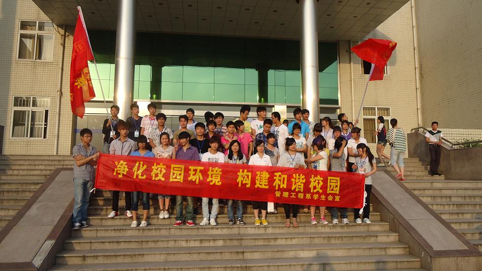 管理工程系于2012年5月6日下午在校园内开展了以“净化校园环境,构建和谐校园”为主题的校园文明建设活动。此次活动由团总支学生会全体成员一起参与,为了大力弘扬“团结、友爱、互助、奉献”的精神,同学们积极踊跃、兴致昂扬。本次活动的举办既提高了大学生的综合素质,又为文明校园的建设贡献了一份力量。