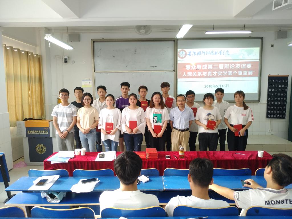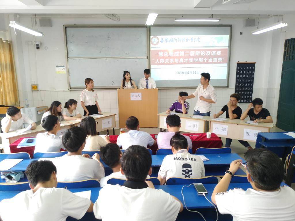 2018年5月16日,经贸管理学院慧众聚成校企合作班第二届大学生辩论赛决赛在2教105教室举行。共有17电子商务一班代表队、17电子商务二班代表队以及17信息安全一班代表队等3支队伍参赛。慧众聚成的老师及各专业老师出席此次比赛。
