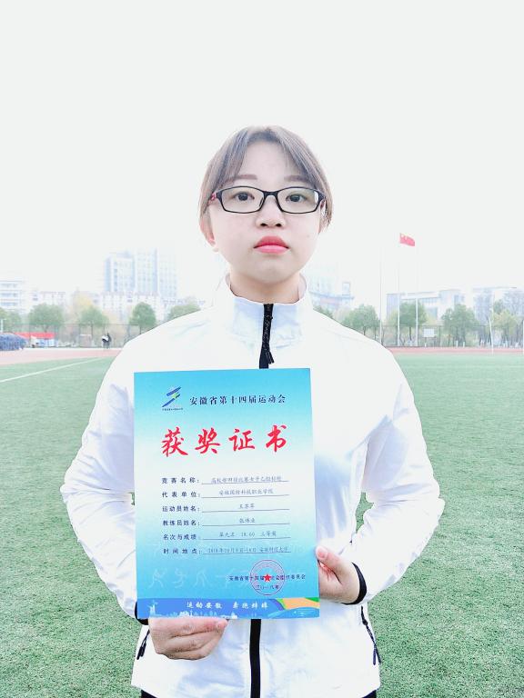 王苏苹,女,出生于1999年6月2日,安徽省安庆市潜山县人,现就读于beat365唯一官方网站17级市场营销专业。在校期间,大一担任院学生会生活部委员,校体育部委员,现担任我院学生会生活部部长一职,校体育部副部一职努力学习,认真刻苦,在安徽省第十四届运动会高校部田径比赛女子标枪中,荣获三等奖,荣获beat365去年校运动会中铁饼第六名、跳远第七名,今年校运动会铁饼第一名跳远第八名