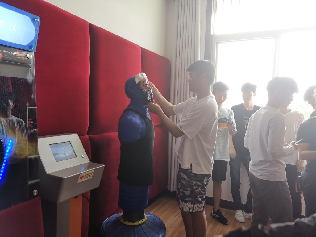 参观中,许老师向同学们介绍了心理健康中心的各个功能室。在团体辅导室,心理健康中心老师通过心理游戏、拓展训练、讨论吧等各种形式为同学们提供团体辅导活动,并通过团体成员间的互动,开发个体潜能,增强适应能力,从而实现成员的积极探索与自我成长。心理宣泄室内的“模拟人体”以及“智能音乐宣泄仪”这些宣泄设备是基于认知心理学理论,利用人际互动技术为来访者提供呐喊、击打等情绪调节训练,帮助学生科学有效地行为发泄,以此缓解内心压力。沙盘游戏室是利用一盘细沙,一架子各式各样的物件造型,来呈现出来访者的内心世界。整个参观过程中,学生们认真倾听、满怀好奇,纷纷踊跃体验。