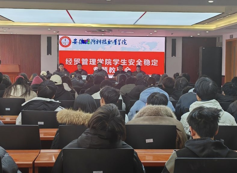 本网讯(经贸管理学院 王超)时值期末,新年将至。根据省教育厅及学校工作部署,为进一步切实强化岁末年初学生安全工作,12月30日中午,经贸管理学院在产教融合中心第二报告厅召开学生安全稳定专题教育大会。学院党总支书记刘峰、党总支副书记韩纪平、学院辅导员及学生宿舍安全信息员参加会议。
