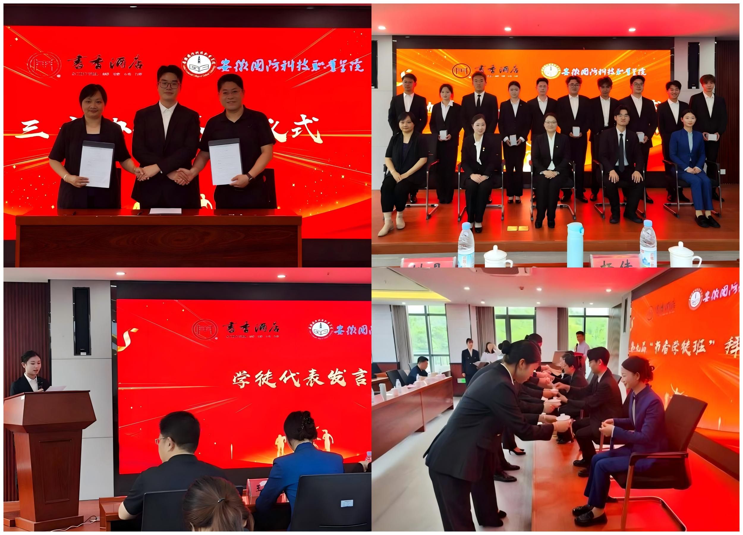 为进一步搭建校企共育桥梁,推动产教融合,传承尊师重道文化,5月13日至14日,beat365分别与肥融创文旅城酒店群、合肥洲际酒店、苏州书香酒店合作开展24级酒店管理与数字化运营专业现代学徒制拜师仪式系列活动。经贸管理学院院长杨力、酒店管理专业带头人司首婧、年级辅导员张洋洋、班主任张辰辰及24级酒店管理专业全体学生出席拜师仪式。