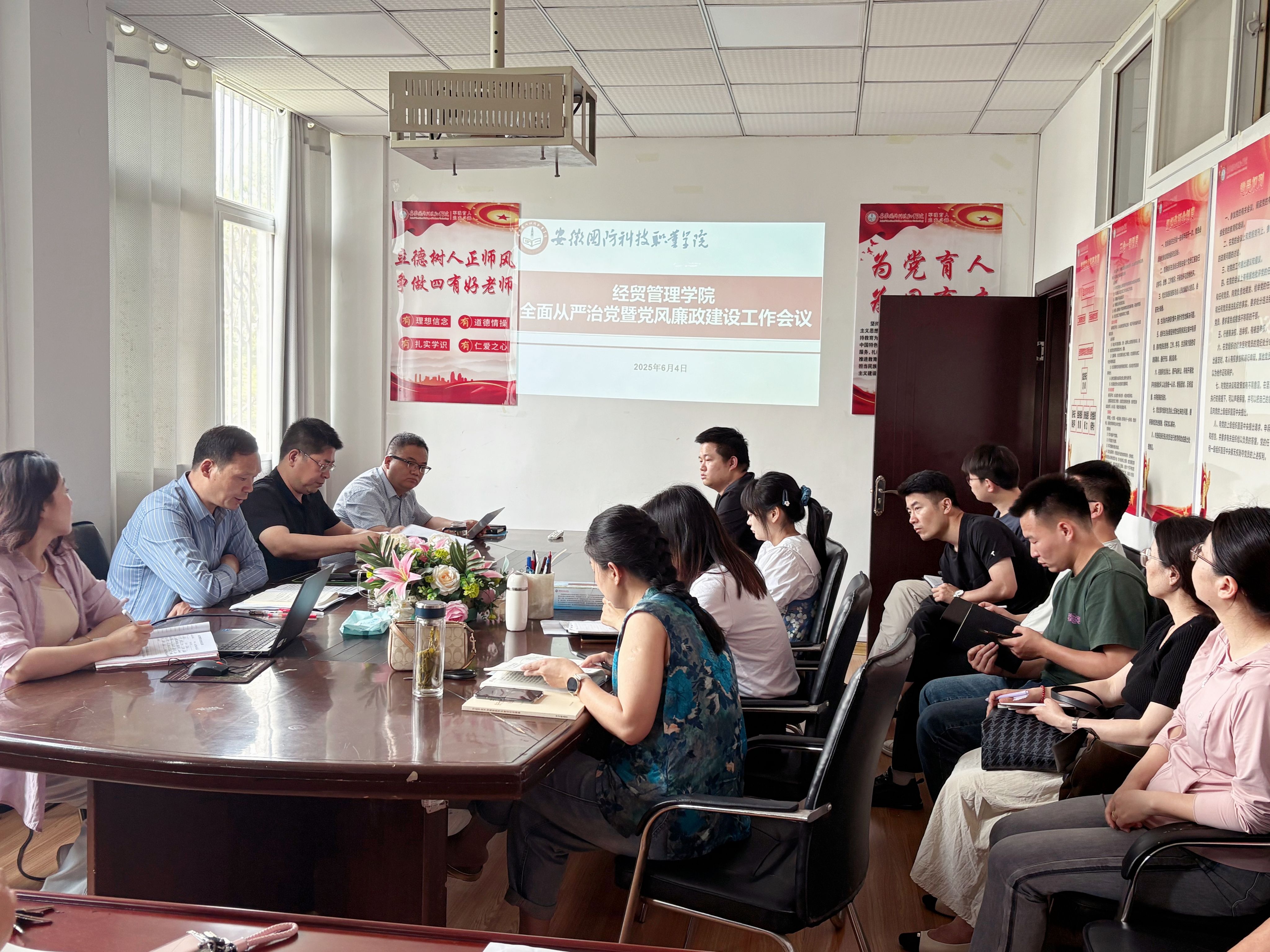 为深入贯彻落实党的二十大及二十届二中、三中全会精神,扎实推进全面从严治党和党风廉政建设工作,6月4日下午,经贸管理学院召开2025年度全面从严治党暨党风廉政建设工作会议。学院党总支书记刘峰主持会议,学院党政领导班子成员和全体党员参加会议。