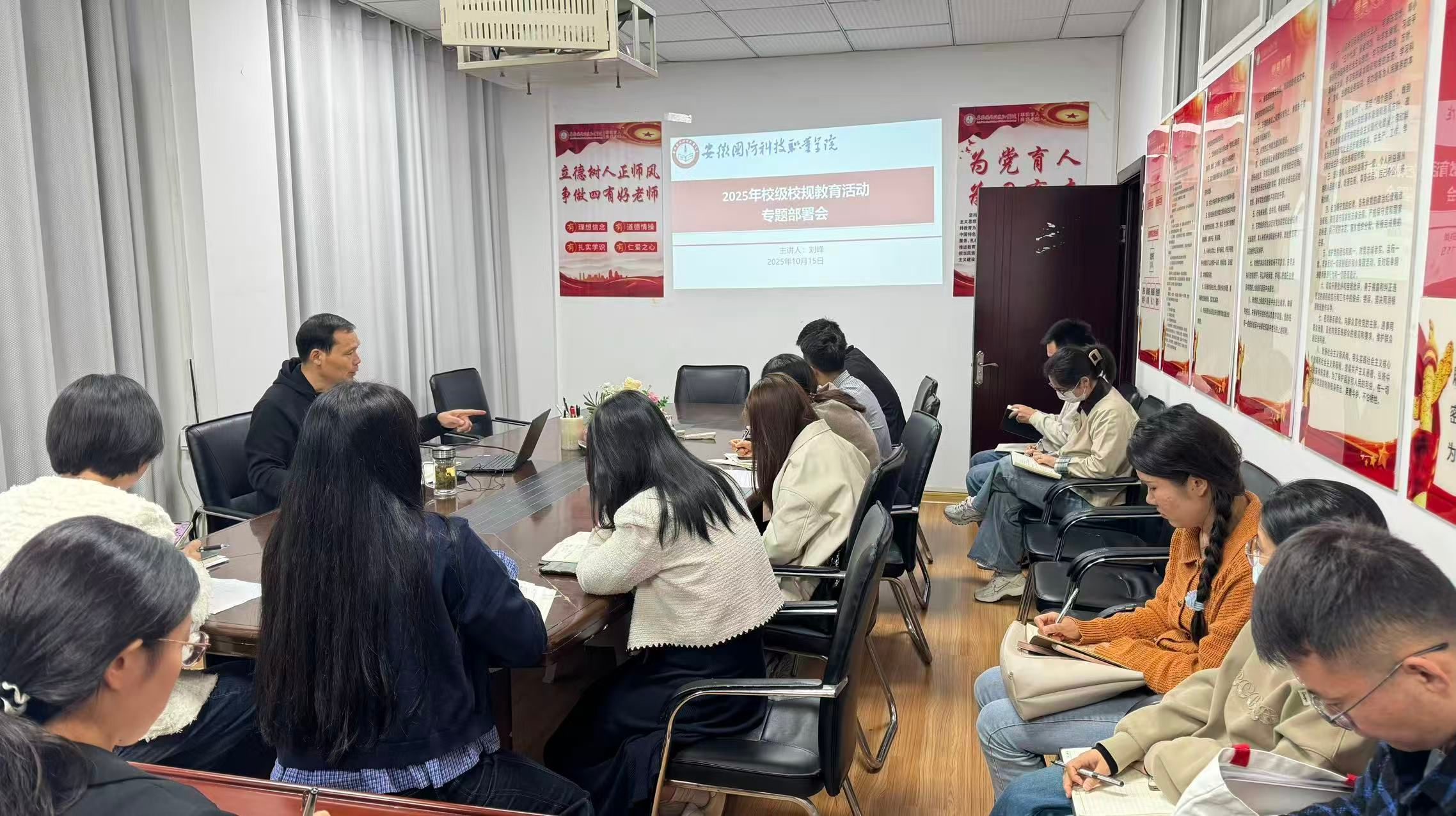 为深入贯彻落实《关于开展2025年校纪校规教育活动的通知》精神,全面推进校纪校规教育活动落地见效,切实增强学生规则意识与安全观念,10月15日下午,经贸管理学院党总支书记刘峰主持召开专题会议部署2025年校纪校规教育活动,学院全体辅导员参加会议。