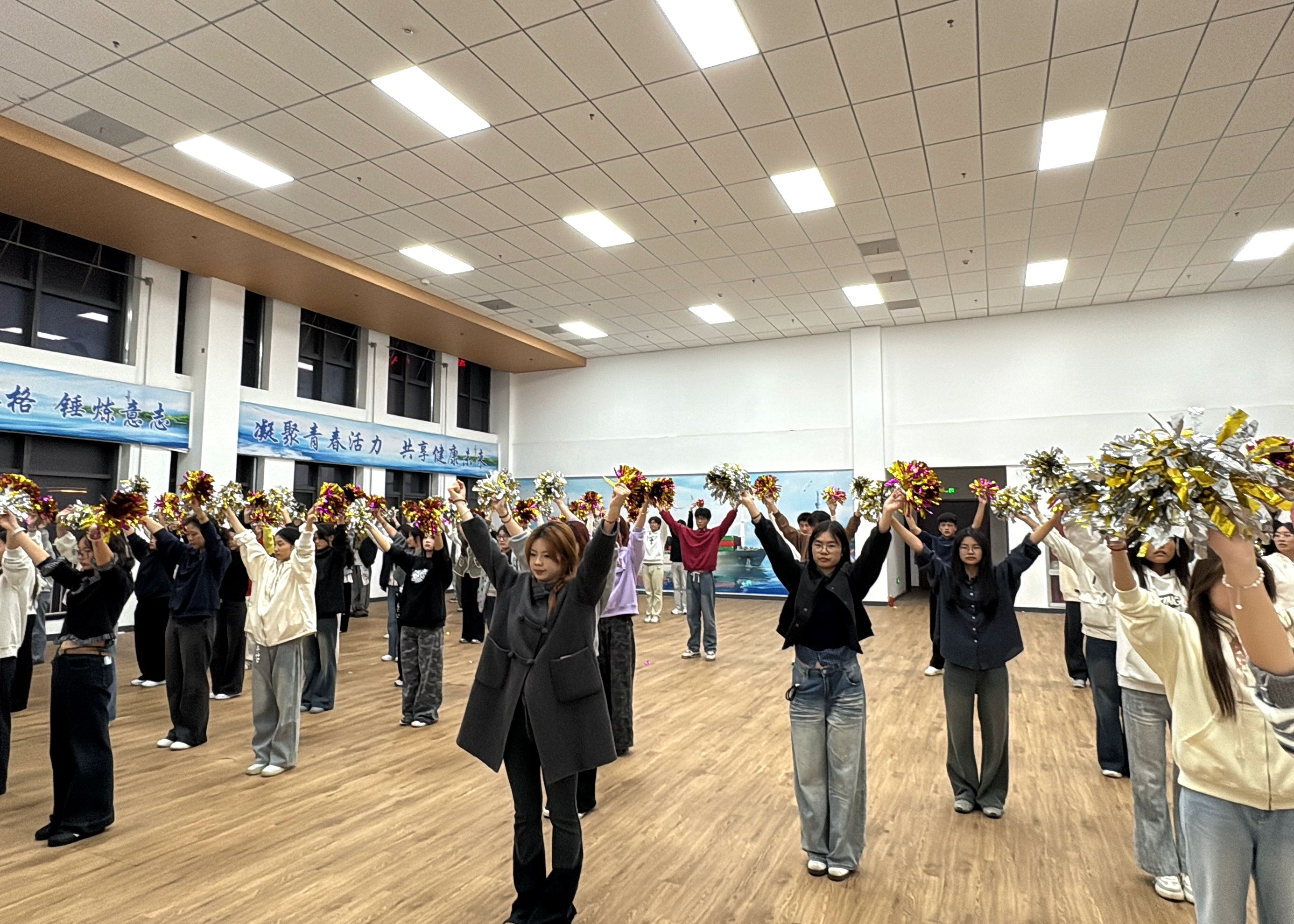 学院高度重视此次比赛,为呈现最佳表演效果,学院同学们在赛前开启了为期一个月的集中训练。从基础动作的规范矫正到复杂队形的默契配合,从音乐节奏的精准把控到精神面貌的全面提升,同学们主动放弃课余休息时间,在学院领导老师的悉心指导与领舞同学的专业带领下,逐帧打磨每个细节、反复推演每段流程。训练场内汗水浸湿衣衫却无人叫苦,动作重复百遍仍精益求精,大家心往一处想、劲往一处使,用坚持与坚守凝聚成团结向上的集体力量,用执着与拼搏诠释着青年学子的责任担当。