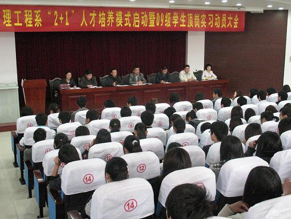 2011年4月13日中午一点三十分,管理工程系于图书馆学术报告厅召开 “2+1”人才培养模式启动暨09级学生顶岗实习动员大会。参加会议的主要人员有:系主任张显国、党总支书记杜先扬、副主任刘圣春、工商管理教研室主任余波、经济与贸易教研室主任马业保、工程经济教研室主任王红林、系团总支书记杨力、系就业秘书宋杨以及各班班主任。会议由杜书记主持。