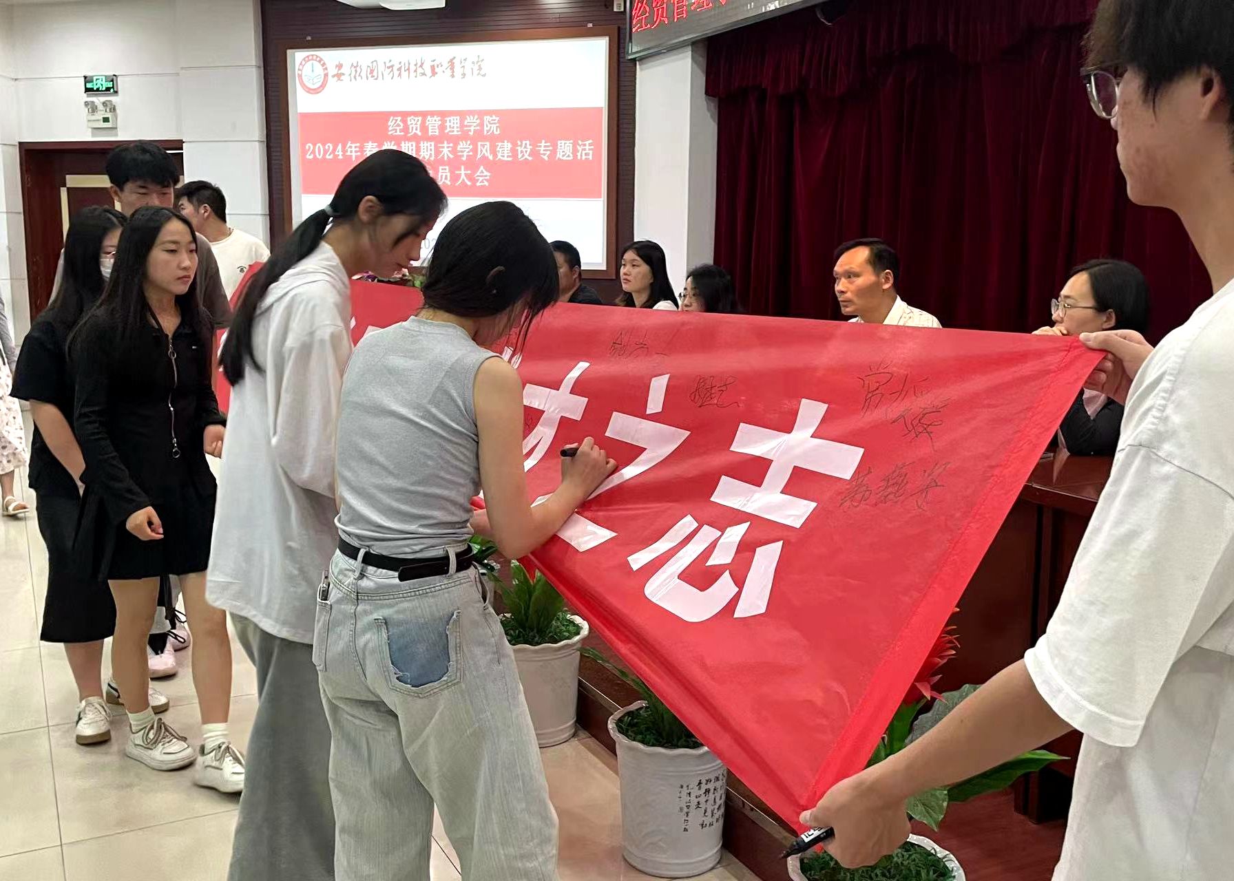 会上,赵小娜传达了《经贸管理学院2024年春学期期末学风建设专题活动实施方案》,学生代表分别作出学风建设诚信考试承诺、学生干部作风建设倡议,全体学生代表在横幅上签字并留影。