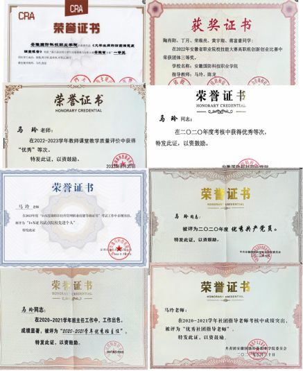 爱岗敬业,爱生如子 在教学岗位和学生管理上,坚持时刻发挥党员教师的榜样示范作用,引导学生建立优良的学风、树立正确的价值观、确立大学生爱党爱国的时代先锋意识。马老师先后指导学生获国家级省级各类大赛,学生获奖众多,成绩斐然,并多次获比赛“优秀指导教师”荣誉称号。马老师工作积极主动、关爱学生,曾获校级“优秀共产党员”、“优秀教职工”、“优秀班主任”、“优秀社团指导老师”等荣誉称号。