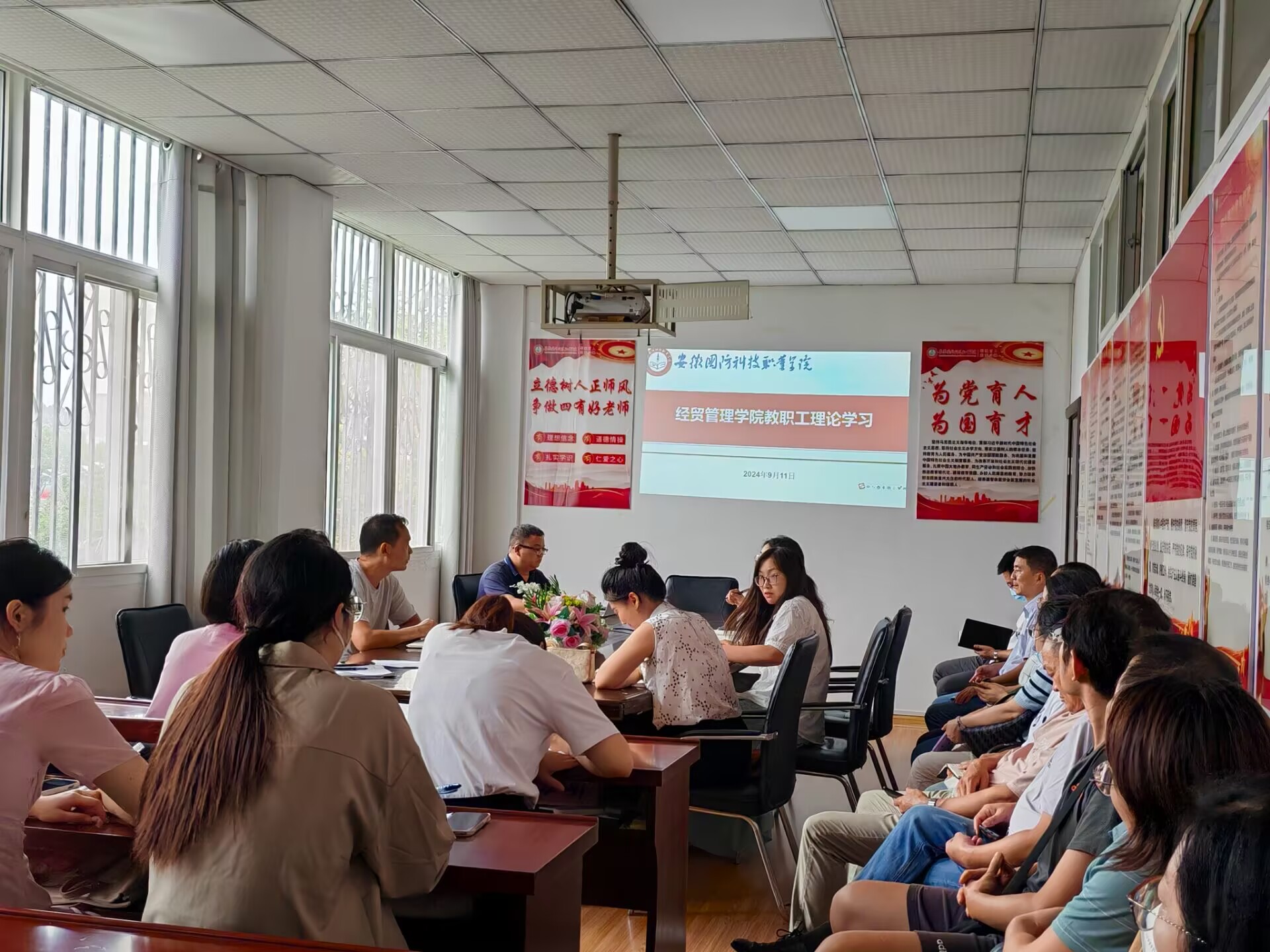 根据工作部署,9月11日,经贸管理学院召开全院教职工学习活动,学习贯彻全国教育大会精神,持续加强师德师风建设,活动由院党总支书记刘峰主持。