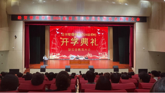 金秋送爽,丹桂飘香,9月27日晚,经贸管理学院新生开学典礼暨安全教育大会在产教融合中心多媒体报告厅举行。学院领导刘峰、杨力、杨学分以及24级全体辅导员和新生欢聚一堂,报告厅内座无虚席,气氛热烈。大会分两个阶段进行。
