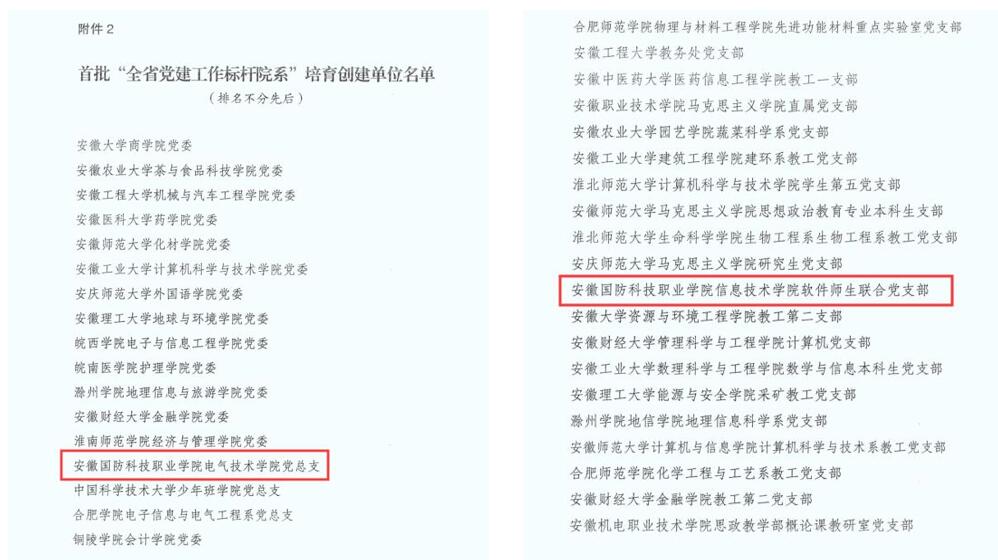 本网讯(组织人事处 杨志清)近日,安徽省委教育工委公布了首批全省党建工作标杆院系、样板支部培育创建单位名单,beat365电气技术学院党总支获批全省党建工作标杆院系培育创建单位,信息技术学院软件师生联合党支部获批全省党建工作样板支部培育创建单位。