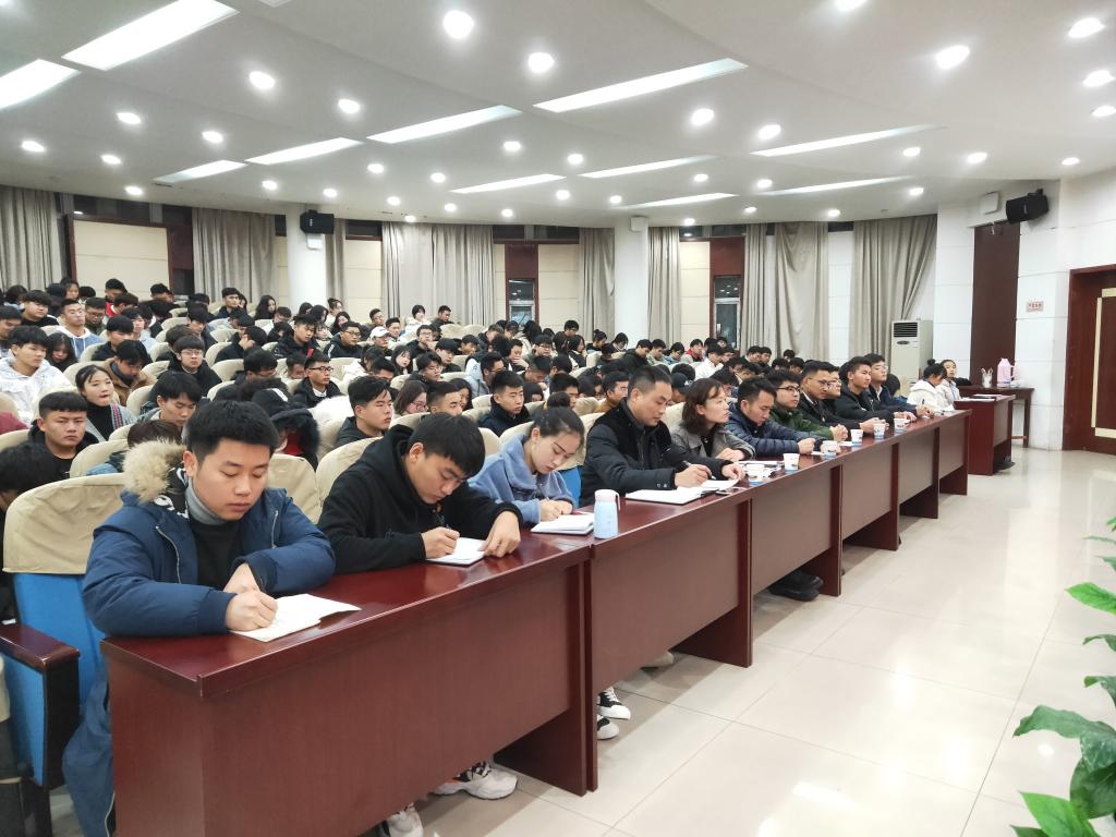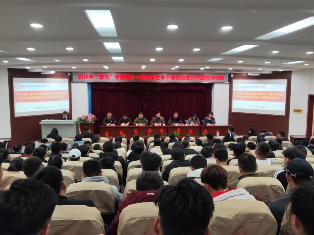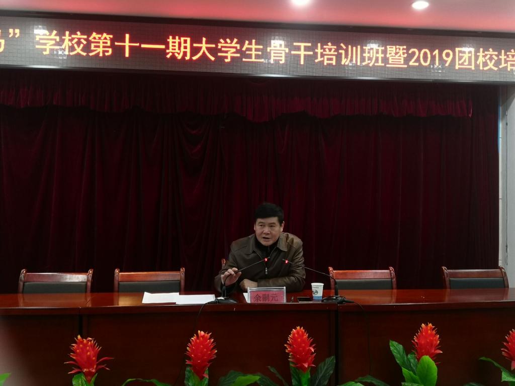 本网讯(团委 缪灵)12月2日晚,2019年“青马”学校第十一期大学生骨干培训班暨2019团校培训班在图书馆报告厅举行。校党委书记余嗣元、教工团支部书记、各二级学院团总支书记和各级团学干部参加了开班仪式。仪式由校团委副书记张红军主持。