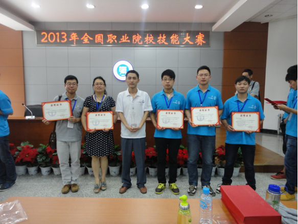 以蒋红云教授(左二)、李存鹏教授(左一)和汤波老师(左三)等老师组成的指导团队,指导学生一举荣获全国职业技能大赛高职组“工业产品造型设计与快速成型”赛项一等奖,实现安徽省该赛项国赛新突破。上图为2013年与指导学生获奖时合影留念。