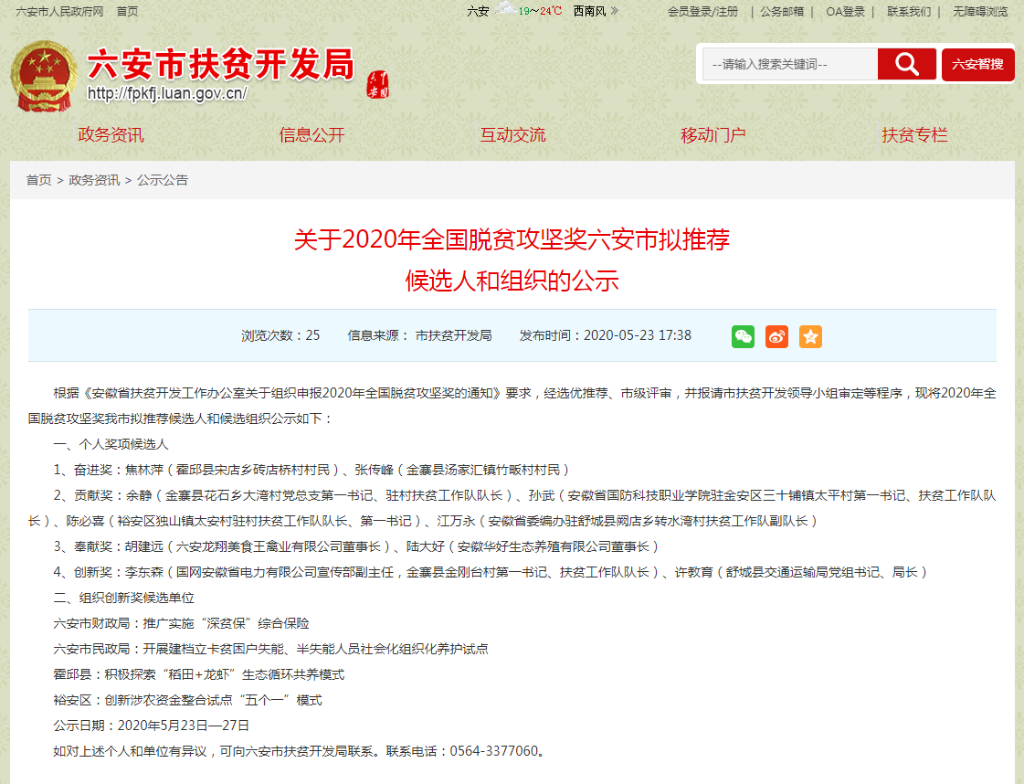 本网讯 近日,六安市扶贫开发局网站和六安市人民政府微信公众号发布关于2020年全国脱贫攻坚奖六安市拟推荐候选人和组织的公示,beat365唯一官方网站驻金安区三十铺镇太平村第一书记、扶贫工作队队长孙武荣获2020年全国脱贫攻坚贡献奖六安市拟推荐候选人。