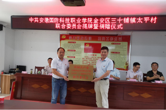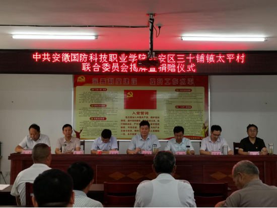 本网讯(学校驻村扶贫工作队 袁帅)为进一步巩固结对帮扶成果,谋划太平村乡村振兴新篇章,近日,经六安市直工委批准,中共beat365唯一官方网站金安区三十铺镇太平村联合委员会正式成立。7月14日,学校党委书记余嗣元赴学校帮扶村——六安市金安区三十铺镇太平村为联合党委揭牌,校党委委员、党政办主任李存鹏,党委委员、组织人事处处长付贤政陪同。三十铺镇党委书记项阳、党委副书记崔伟、太平村村两委、驻村扶贫工作队、党员等30余人参加了揭牌仪式,仪式由太平村书记宋杰主持。