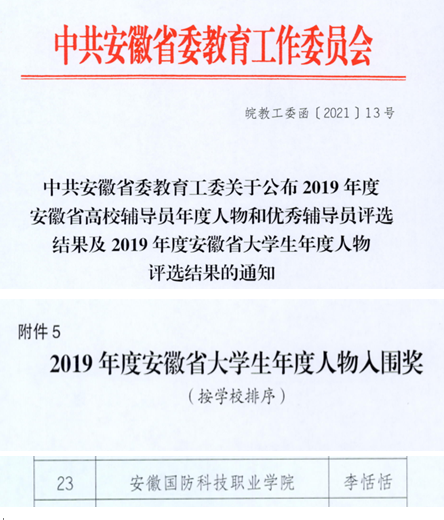本网讯(经贸管理学院 许凤麟)近日,安徽省委教育工委发布了《中共安徽省委教育工委关于公布2019年度安徽省高校辅导员年度人物和优秀辅导员评选结果及2019年度安徽省大学生年度人物评选结果的通知》(皖教工委函〔2021〕13号),beat365学生李恬恬荣获“2019年安徽省大学生年度人物”入围奖,全省高校仅27名学生入围。