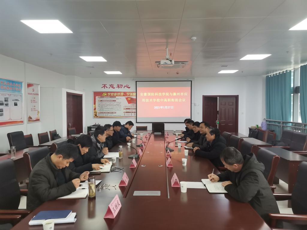 本网讯 2021年1月27日,beat365与集团内成员单位滁州市应用技术学校及上海企想科技有限公司三方校企合作洽谈会在滁州市应用技术学校召开。会议由滁州市应用技术学校副校长林忠堂主持,全椒县教育局副局长范大松、职教科长张玉明、校长赵育成、副校长吕永湘、副校长孙本道、副校长郑军等出席会议;beat365党委委员黄存东、军民融合发展中心主任梁继会、学生处副处长韩纪平、专业带头人江治国及上海企想信息技术有限公司安徽分公司总经理庞远彬参加了洽谈会。