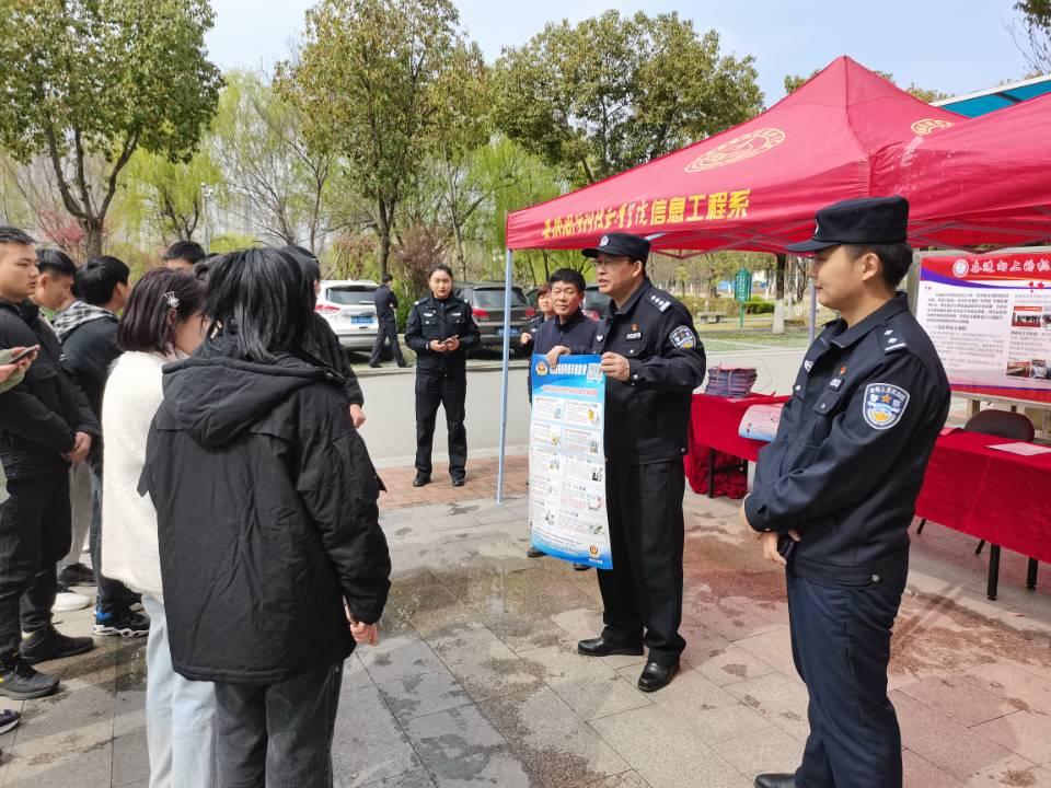 活动首先由国保大队陈勇大队长现场讲解各类新型电信诈骗类型,他指出,近年来,网络电信诈骗的形式越加多样化,校园是电信诈骗的重灾区。发生在大学生中常见的有兼职刷单、冒充客服、冒充QQ熟人、游戏充值诈骗、校园贷、手机短信诈骗等电信诈骗类型。民警和宣传人员告诫同学们千万不要贪图小利,要与家人多核实、沟通,必要时拨打公安机关110报警电话请求帮助。他们劝诫同学们面对网络电信诈骗要“不失理性、不掉陷阱、不贪便宜”,要提高防范意识和自我保护能力,抵御不法侵害。做到绝不泄露自身账户密码,坚决不向陌生人账户汇款。