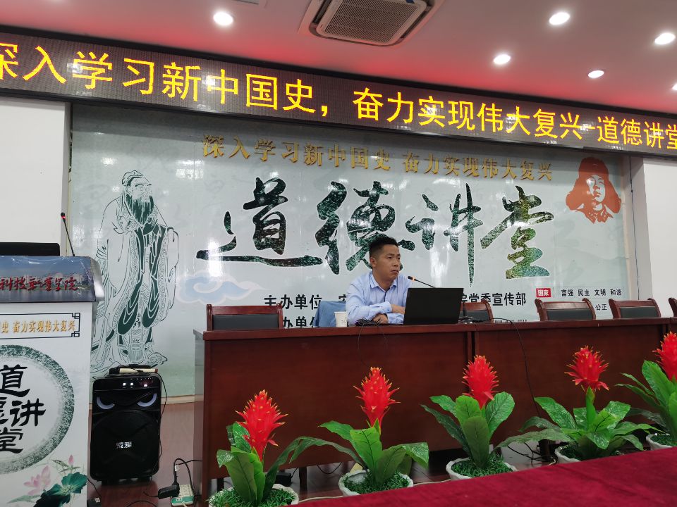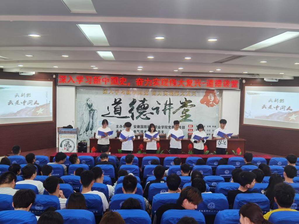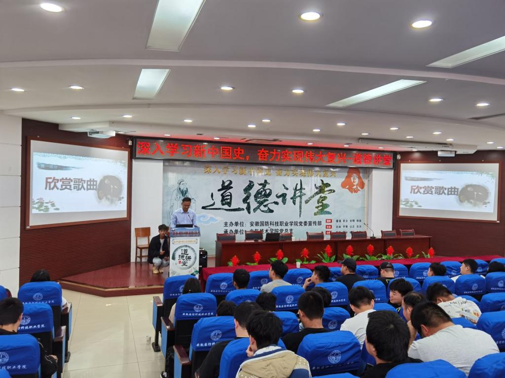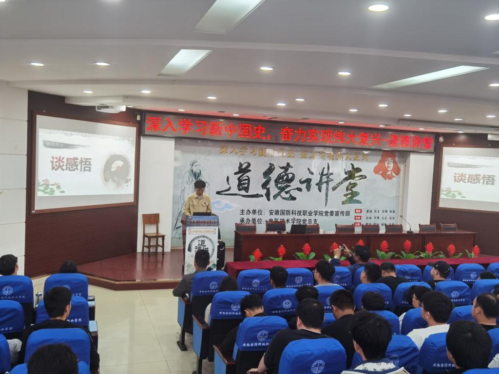 本网讯(电气技术学院 王腾州)为弘扬中华民族传统文化,积极培育践行社会主义核心价值观,根据庆祝建党100周年有关活动安排和《关于开展2021年六安市“道德讲堂”活动的通知》(六文明办〔2021〕5 号)等精神,结合新冠疫情防控实际,2021年5月12日下午,由党委宣传部主办、电气技术学院承办的“深入学习新中国史,奋力实现伟大复兴”主题道德讲堂在校图书馆报告厅开讲。
